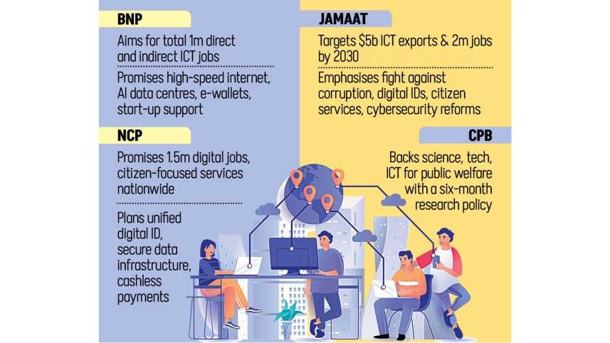 Several political parties have positioned ICT as a core economic driver. The Bangladesh Nationalist Party (BNP) has proposed large-scale job creation initiatives targeting cybersecurity, AI, data services, semiconductors, and Industry 4.0, alongside infrastructure commitments such as nationwide high-speed connectivity and near-constant network reliability through a proposed Connectivity Masterplan. Plans also include introducing global payment platforms, building AI-driven data center infrastructure, and expanding startup funding mechanisms. Analysts note, however, that current workforce capacity remains significantly below projected targets.